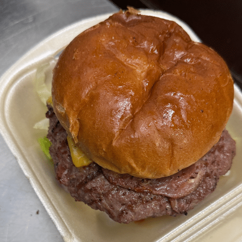 2 st. Mini Runderburger met chedarkaas, afgetopt met sla, tomaat, rode ui en hamburgersaus