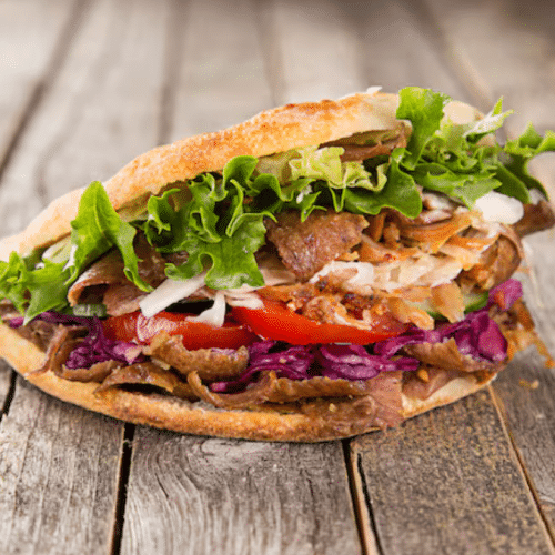 Brood met gyros (varkenreepjes) met Griekse kruiden, sla en ui met tzatziki saus