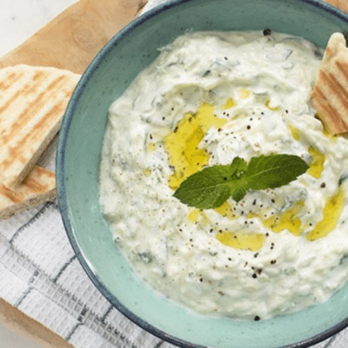 Rundergehakt met Griekse kruiden Geserveerd met tzatziki, patat en salade